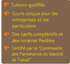 - Nous proposons aussi des cours de langues spécialement pour le monde des affaires tant pour le secteur public que pour le secteur privé. Nos cours sont conçus pour les compagnies ou pour les individus, pour de petits groupes ou sur une base individuelle.
